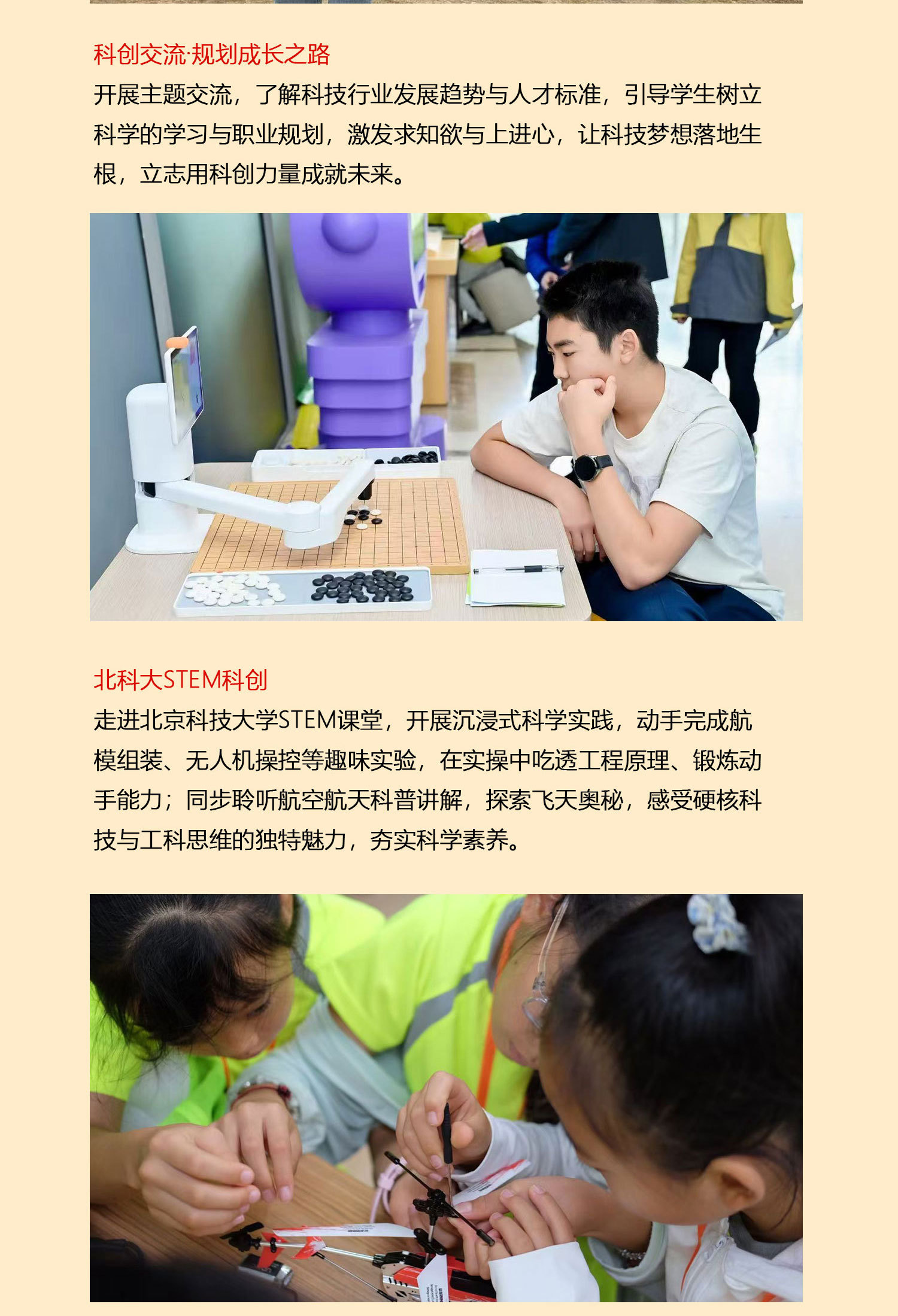 课 1:科普讲堂:观看北科大宣传片,了解北科大的历史文化以及北科大对我国的重要性;带领学生们进行“天驰”动力飞机制作,体验无人机模拟器操作
