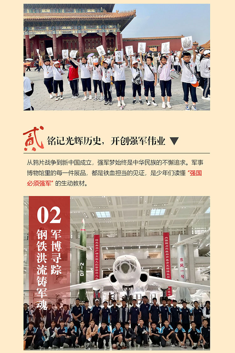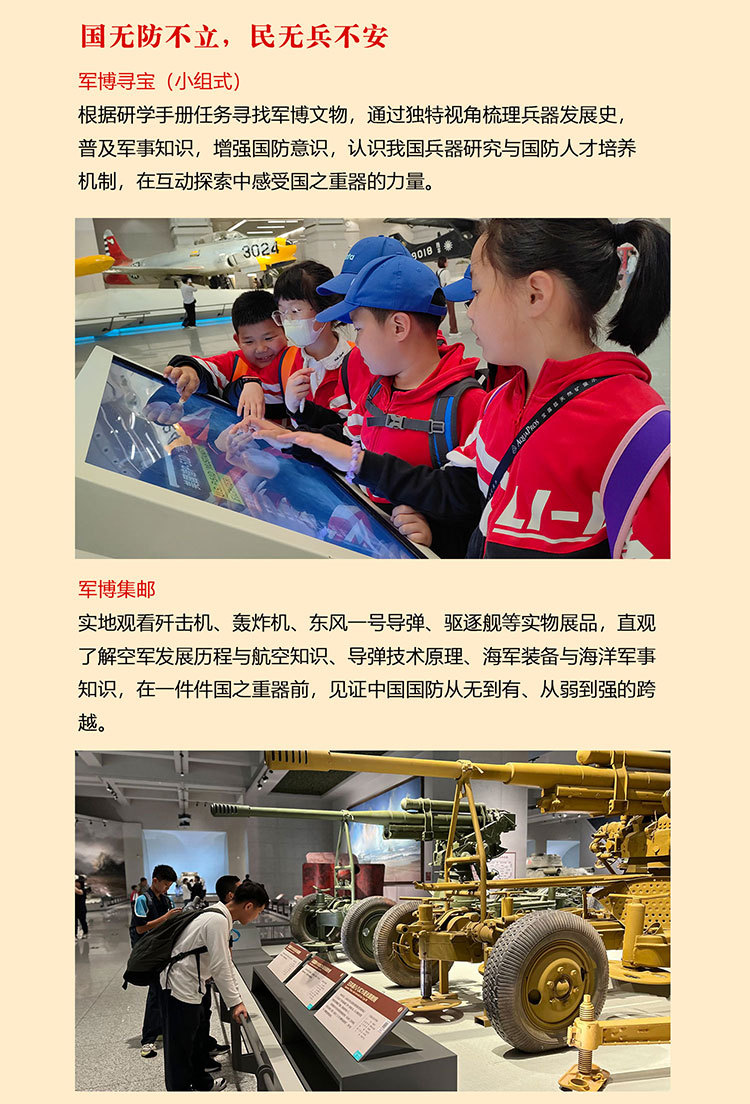 课 2:军博集邮;通过实地观看歼击机、轰炸机、歼击轰炸机、东风一号以及驱逐舰、护卫舰、巡洋舰等实物直观了解空军发展历程与航空知识、导弹相关知识、海军装备与海洋军事知识