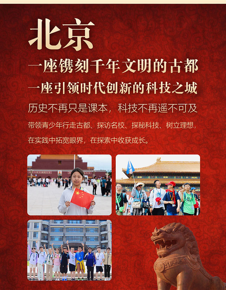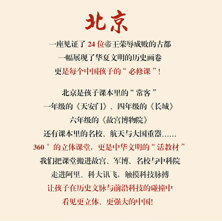 天安门广场、故宫博物院、军事博物馆、前门大街、北京大学或清华大学、中国人民大学或北京师范大学、奥林匹克公园(鸟巢水立方外观)、科大讯飞或阿里巴巴、北航陆士嘉实验室或北科大 Steam 课程、居庸关长城、中国科学院