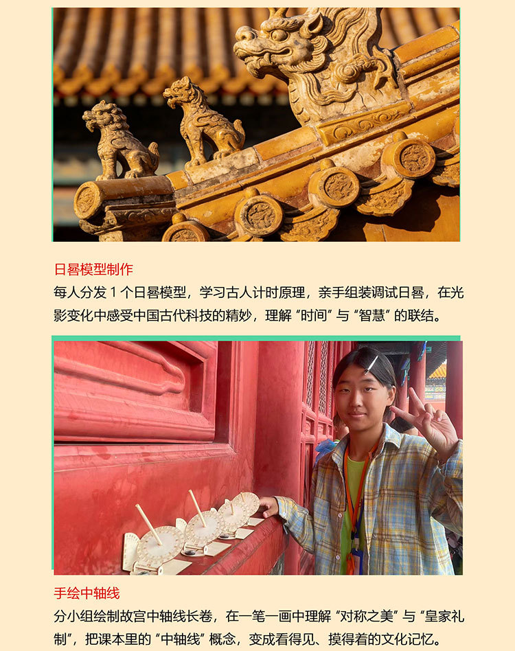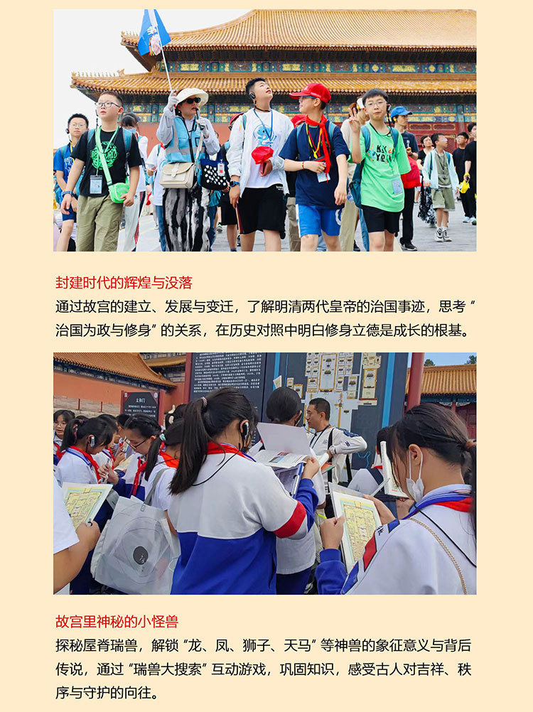 课 5:故宫里神秘的小怪兽;仔细倾听研学老师的讲解,了解故宫中的瑞兽有哪些,以及象征的意义和背后的故事,最后通过“瑞兽大搜索”巩固所学知识。