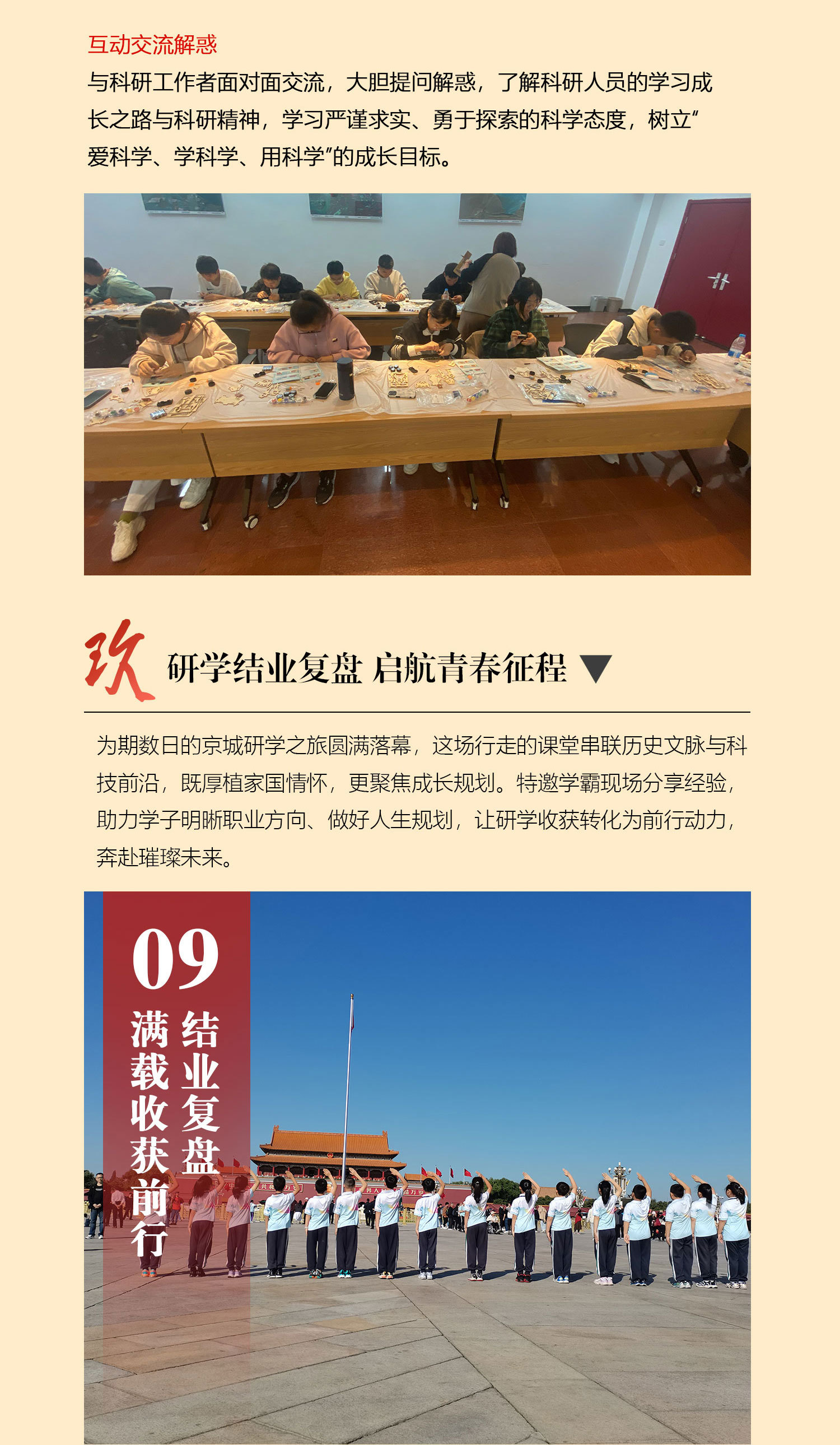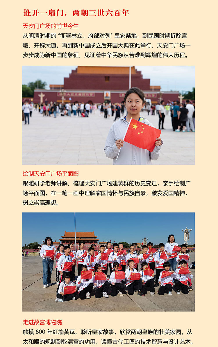 课 2:绘制天安门广场平面图;跟随研学老师的讲解,了解天安门广场建筑群的前世今生,激发学生的爱国精神,树立崇高理想,争当时代的接班人