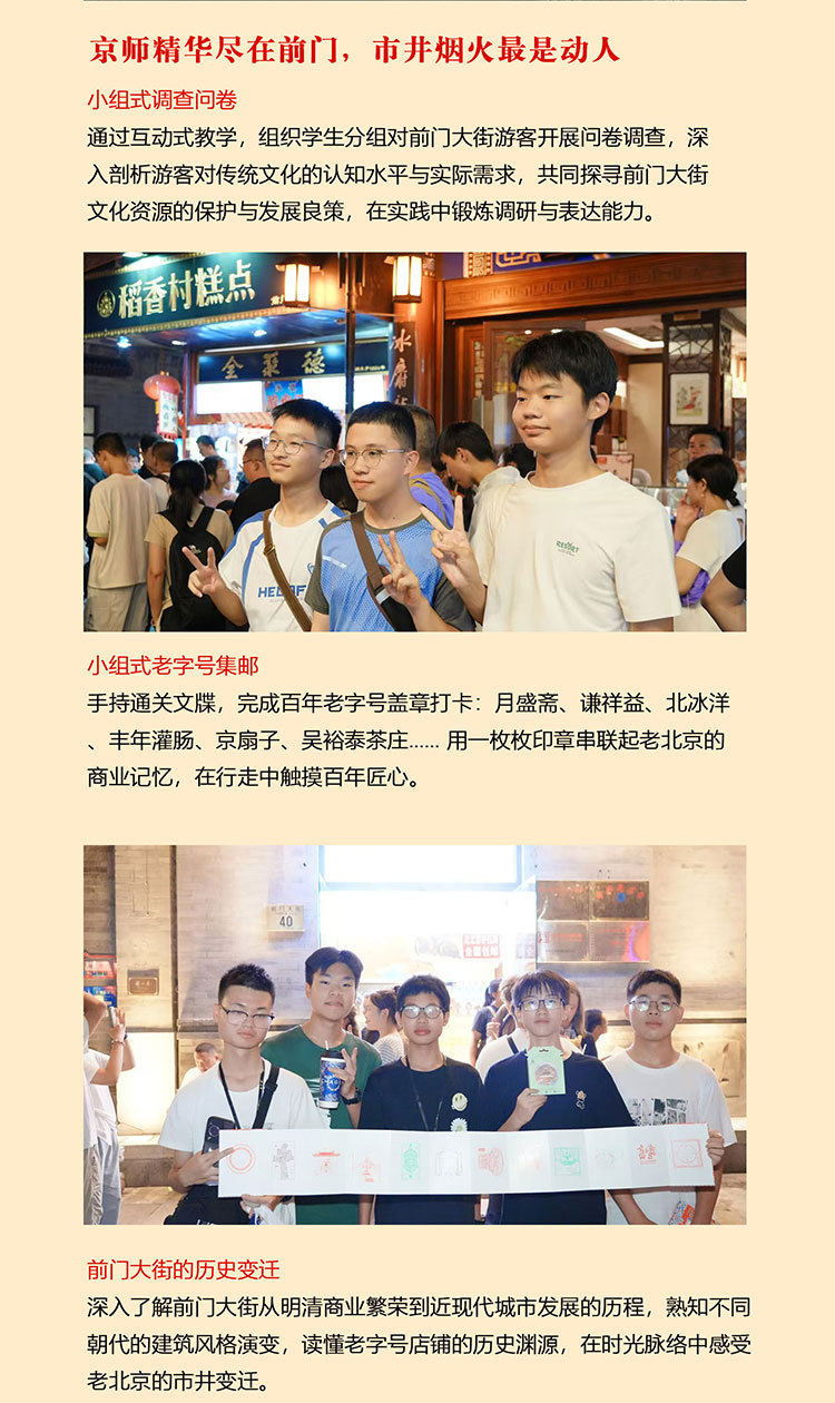 课 2:小组式老字号集邮;前门大街通关文牒百年老字号盖章打卡:月盛斋、谦祥益、北冰洋、丰年灌肠、京扇子、京花布鞋、北京二锅头、谢馥香、吴裕泰茶庄、都一处等老字号集章。