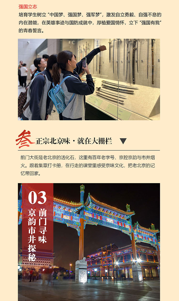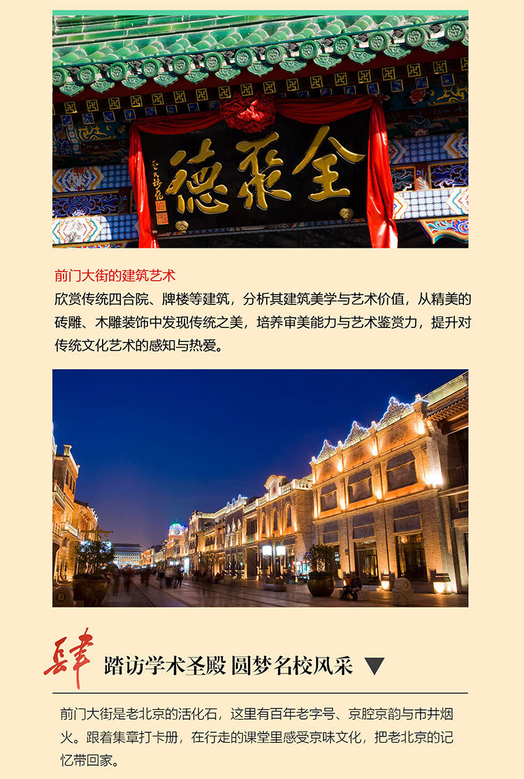 课 3:深入了解前门大街的历史变迁,从明清时期的商业繁荣到近现代的城市发展,熟知在不同朝代的建筑风格演变、老字号店铺的历史渊源。课 4:欣赏前门大街的建筑艺术,包括传统四合院、牌楼等,分析其建筑美学和艺术价值,培养学生的审美能力和艺术鉴赏力,让学生学会从建筑细节中发现美,如精美的砖雕、木雕装饰等,提升对传统文化艺术的感知和热爱。