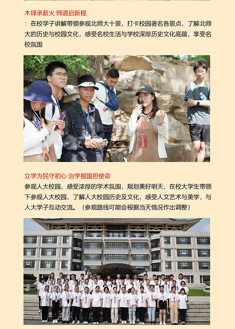 课 1:在校学子讲解带领参观北师大十景,打卡校园著名各景点,了解北师大的历史与校园文化,感受名校生活与学校深厚历史文化底蕴,享受名校氛围