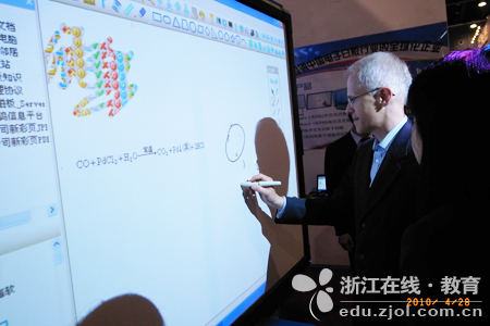 展示会现场的工作人员介绍,这种电子白板利用的是红外线等技术,用笔和手指代替鼠标,就可以在白板上进行各种电脑操作,原理有些类似于手机的触摸屏。