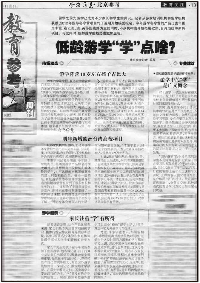 8、记者:目前国内整个游学市场上很多机构组织游学冬令营,大到连锁公司小到几个人的团队都在做国际游学营,在这个国际游学日趋流行的环境下,游学市场竞争也愈演愈烈。家长在其中应如何辨别?