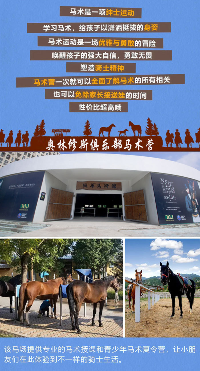 奥林修斯夏令营创立于2007年,为专业组织7-18岁青少年假期活动机构,是将心理学和运动学相结合,拥有自主知识产权的国内冬夏令营优质品牌,隶属“奥望体育”旗下,常年开展篮球、足球、网球、羽毛球、马术、游泳、减肥、军事等训练项目。成立19年来,为20W+的孩子创造了多样化的营期体验。
