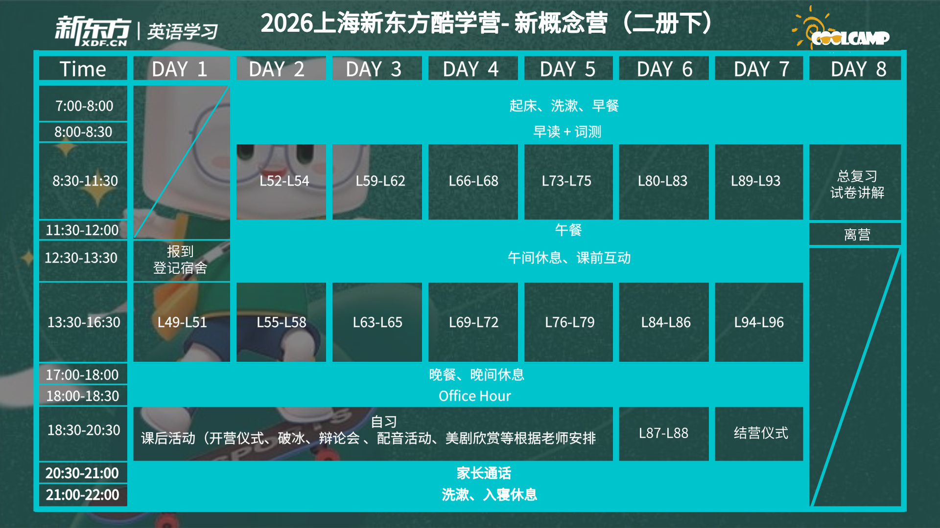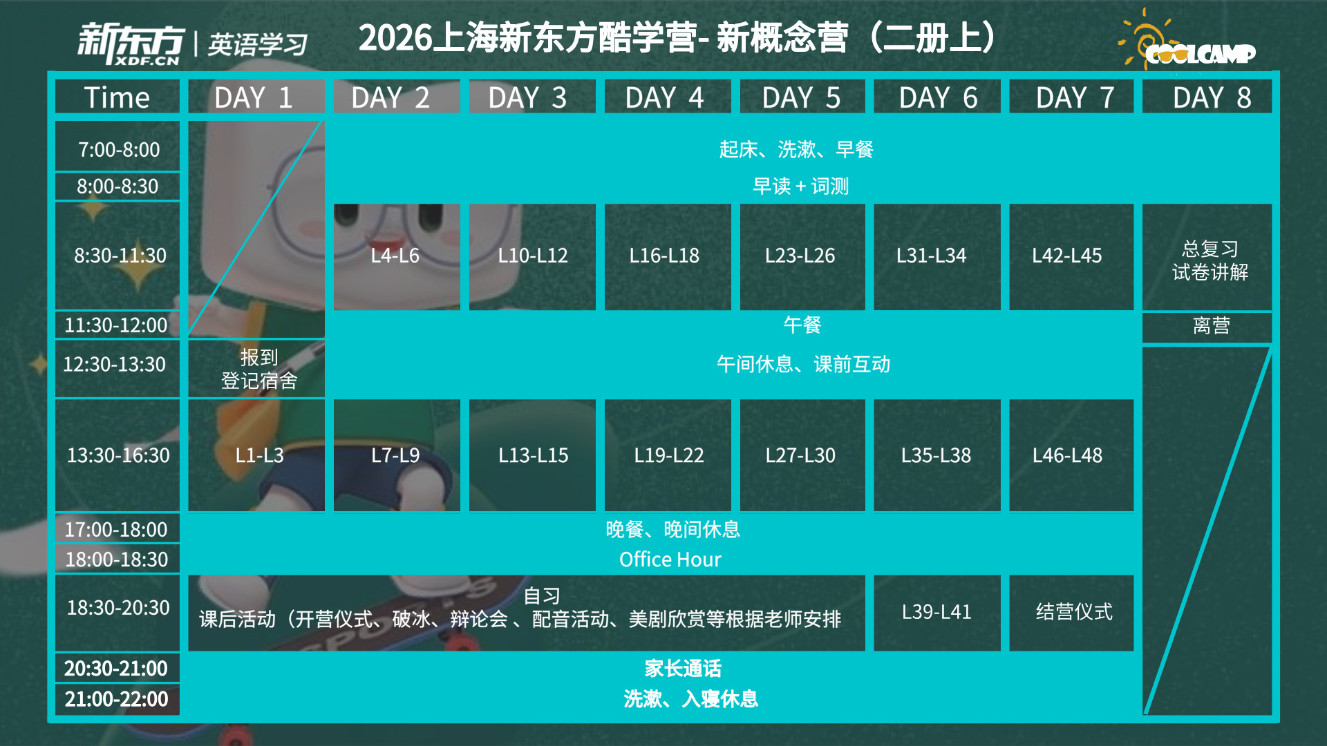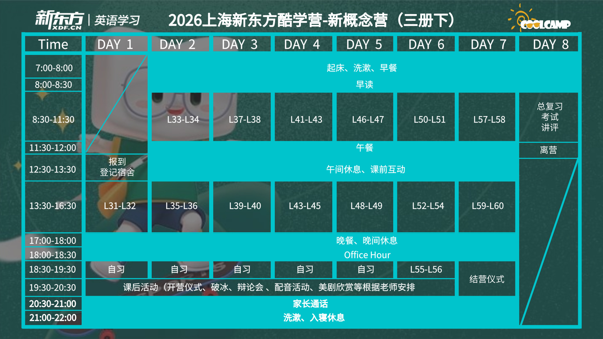 A:酷学营每期8天7晚,其中包含了从开营到结营期间的7晚住宿,因所有住宿都有统一的安排和管理,如外地学员提前到达或延期离开,需自行安排住宿。