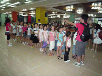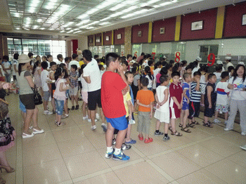 7月17日下午12点30分开始,在新东方酷学酷玩少儿夏令营的报到大厅里,笔者已经可以看到家长孩子陆续到来的身影。男生和女生排成两队,井然有序地进行登记,签协议,领资料,队伍整齐而又安静。在新东方少儿部接待人员的有效指引下,每一个孩子都在报到处停留仅不到3分钟的时间,避免了入营前焦躁的兴奋。