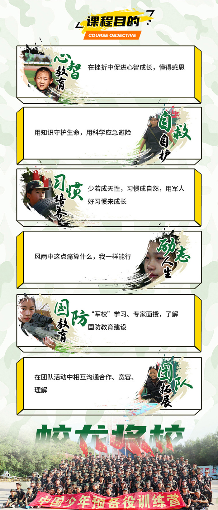主要通过综合性沉浸式系列军事课程:军事行为习惯训练、军事游戏及拓展、野外生存、安全自救、泥潭特训、军事装备体验、军事特色科目训练(海军旗语、警棍盾牌术、野外单兵作训、体能特训、CQB战术特训等),以及国防教育、心智教育、感恩教育等,锻造逆商、塑造情商,培养雷厉风行的作风,坚韧不拔的意志力,让营员认识自我潜能,培养自信心和自控能力,增强营员的领导才能,完善人格。