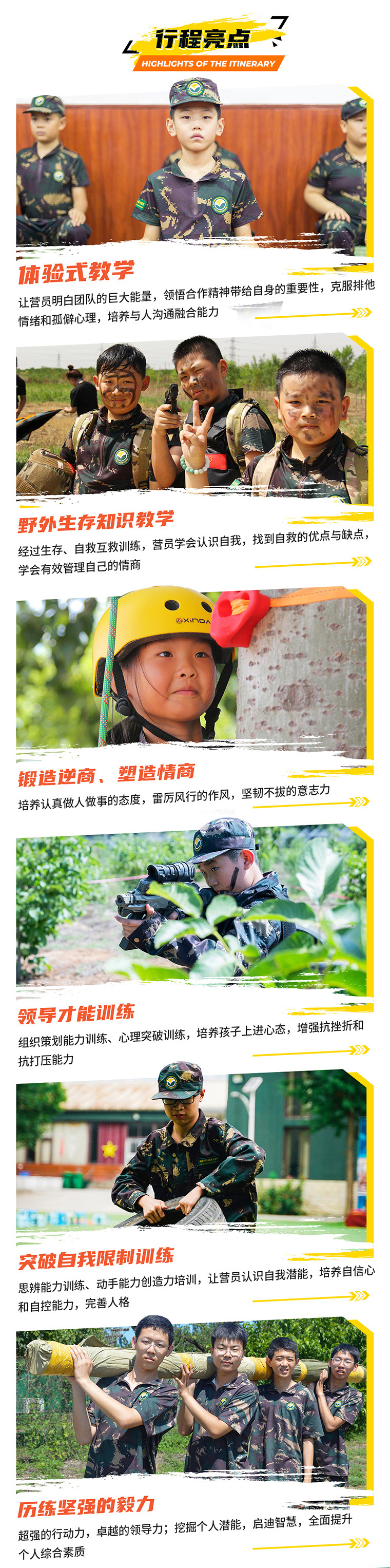 通过沉浸式的军旅主题课程活动,国际童军先进教学理念,系统化的军事课程体系,实战化的训练科目,让营员感觉更有挑战性及刺激性,激发营员领导思维及抗挫性,养成好习惯的同时多元化提升营员的综合素质。