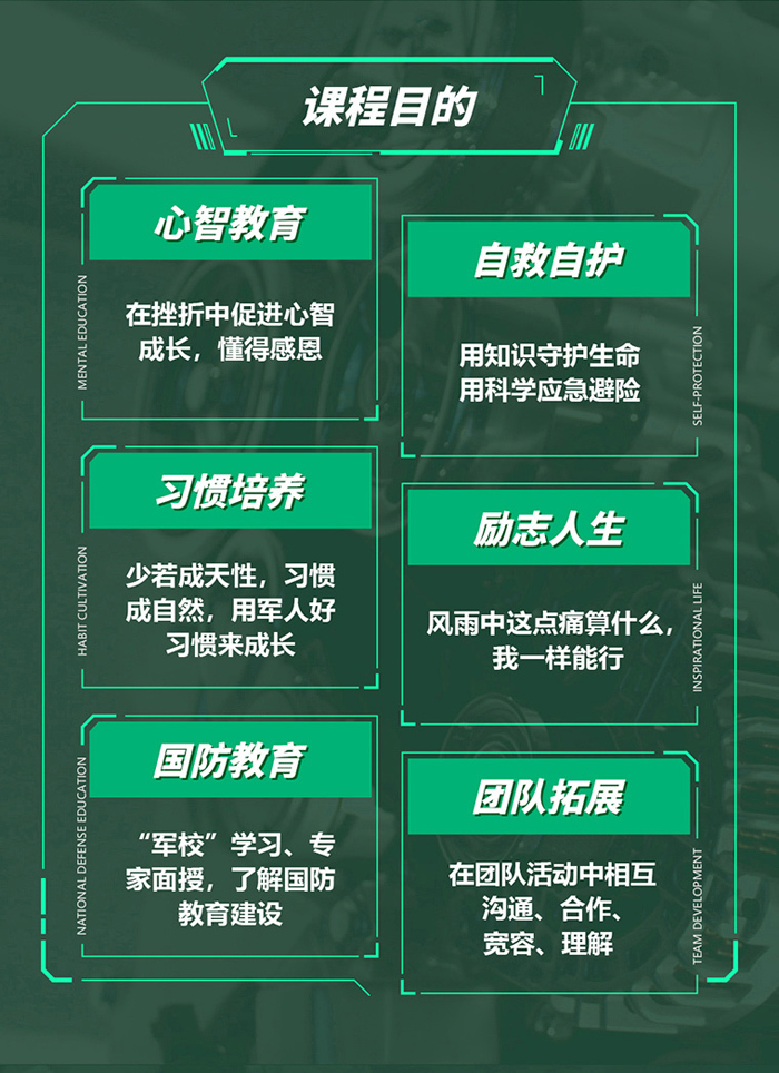 目的:锻炼营员的操作实践军事技能,在实践中成长与收获,挑战极限,激发潜能,培养营员的领导力与战斗力,全面提升军事综合素质。