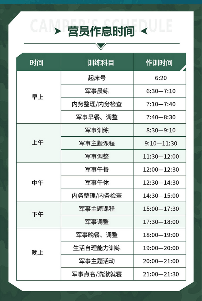 目的:新兵入伍,逐步适应军营生活,培养军事素养,掌握军事技能,使营员重新认识自我,完善个人品质,磨炼意志,激发潜能。
