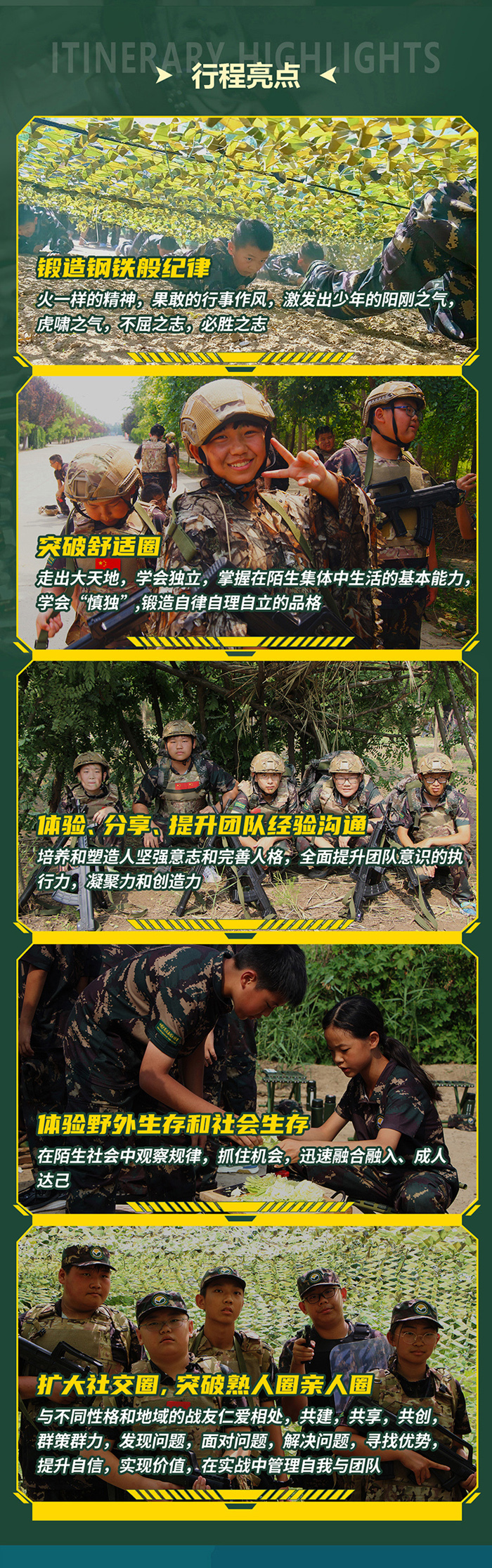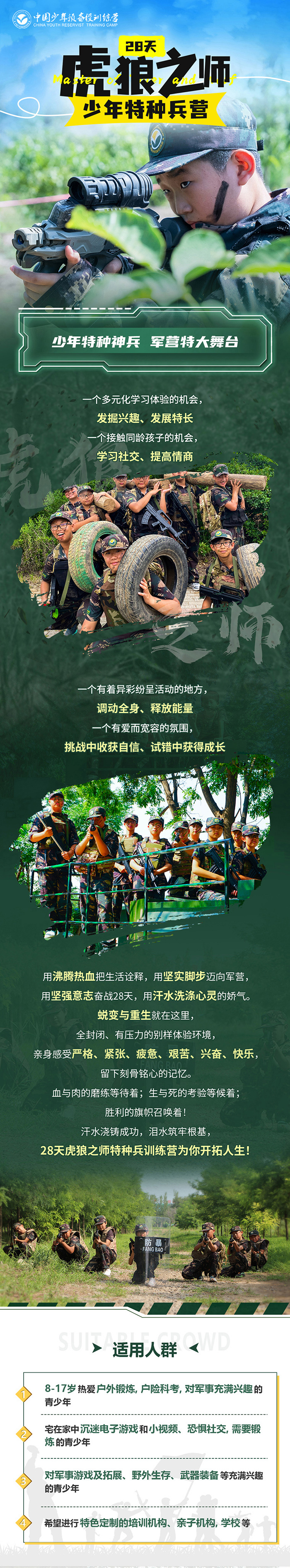 全面综合性沉浸式的特色军事特种兵营,承袭特战部队的训练风格和模式,采用全封闭式军事化管理手段,专业的军事理念融入实战演练、野外生存、泥潭特训、军事拓展、励志感恩、国防教育、三防教育、领导力训练、情商训练、财商训练等综合性主题课程,全方位提升营员的综合素养,养成良好的生活习惯,进而达到完美蜕变。