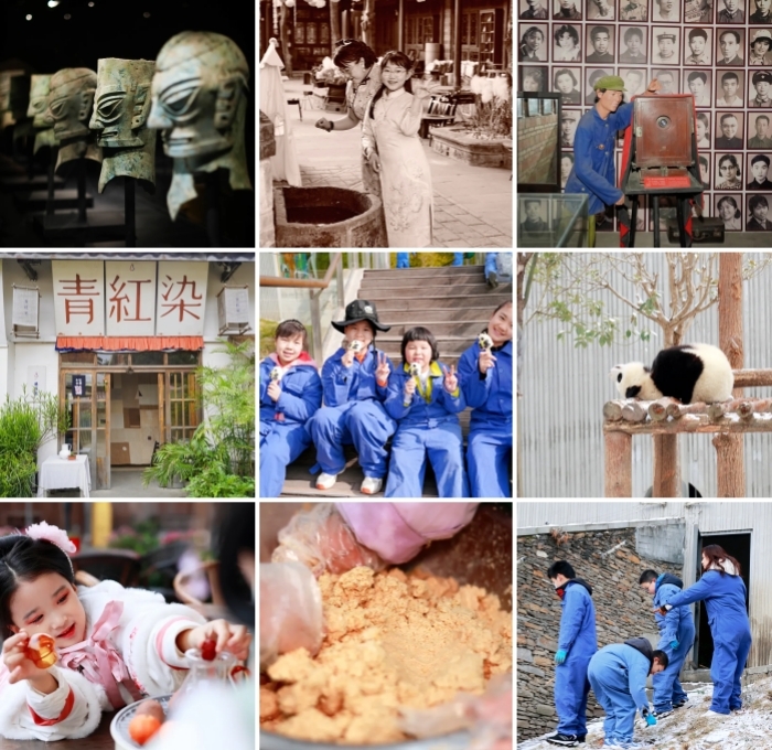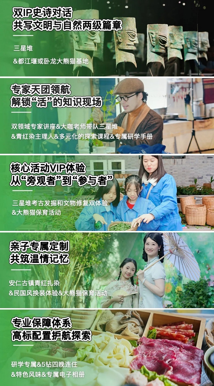 7.活动体验:青铜艺术坊(考古挖掘、文物修复、专家讲座)、安仁古镇民国风换装、围炉煮茶、青红染、熊猫保育义工活动、熊猫专家讲座