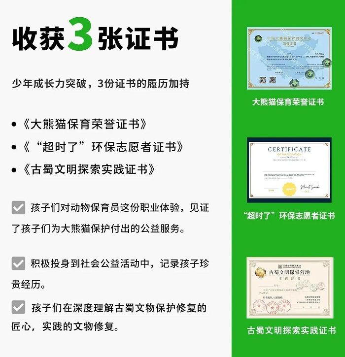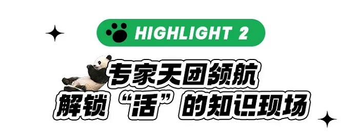 【国宝守护——化身小小“保育员”】从大熊猫的行为习性观察到深入大熊猫国家保护区,并做一名合格的国宝“铲屎官”,走进基地非游客区域进行义工体验。帮大熊猫搬运竹子、在饲养员带领下观看饲养员喂食熊猫、行为观察分析、“制作窝窝头”等等,争取当个被大熊猫认可的一日“保育员”