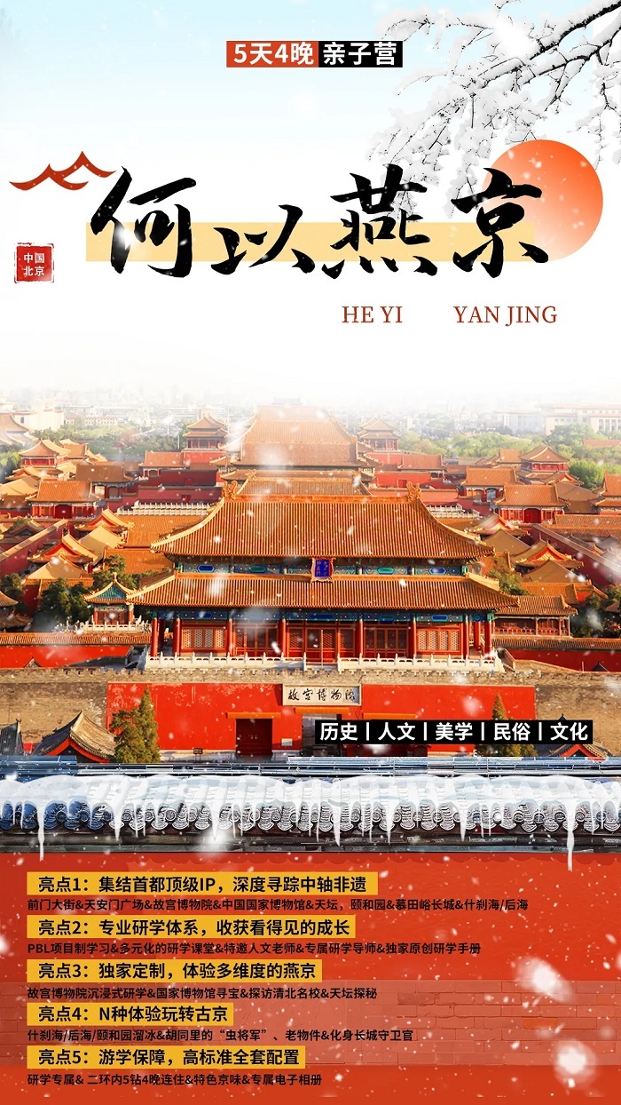 整趟旅程是一场沉浸式的“都城考古”。孩子们将化身为“文化密码破译员”,围绕 「何以燕京」 这一核心命题的深度探究,每日挖掘一个核心密码片段,完成从“符号”到“图谱”的整合,孩子们将依次破译 「秩序、烟火、文脉、山水、脊梁、交融、天人」七大核心智慧维度,系统性地解构北京这座伟大都城的独特生命力,最终形成一个立体而完整的答案,并获得可迁移的文化洞察力