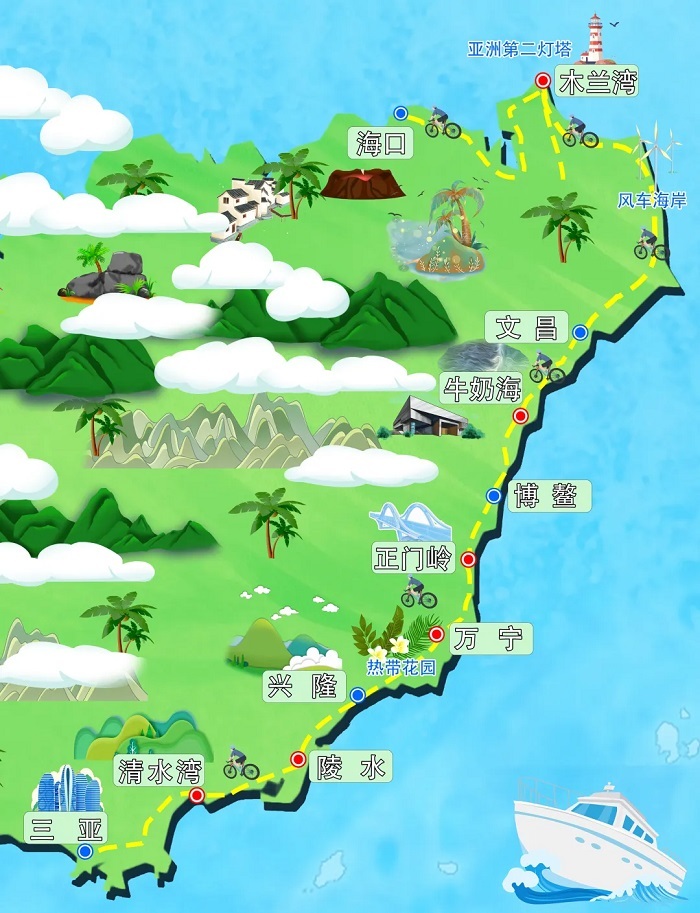 海口、东寨港、木兰湾、环岛旅游公路、文昌、航天大道、龙湾港、博鳌、英豪半岛、南燕湾、石梅湾、热带花园、兴隆、牛岭、陵水、清水湾、土福湾、海棠湾。