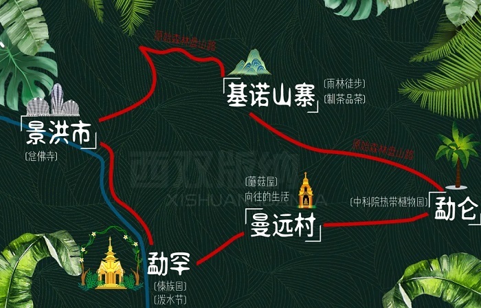 景洪、版纳民族博物馆、总佛寺、澜沧江、橄榄坝、傣族园、勐罕、曼远傣寨、蘑菇屋、中科院热带植物园、勐仑、原始森林、基诺山、热带雨林
