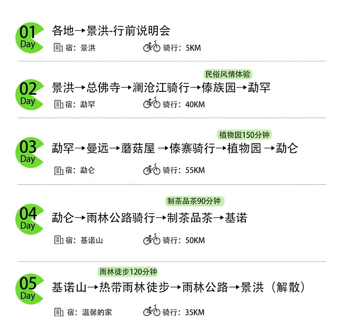 走进热带雨林,在原始的雨林中徒步穿越,之后一路骑行下坡,返回景洪市区,之后返回骑行大本营,进行结营仪式,颁发证书和奖牌,16点前行程解散。