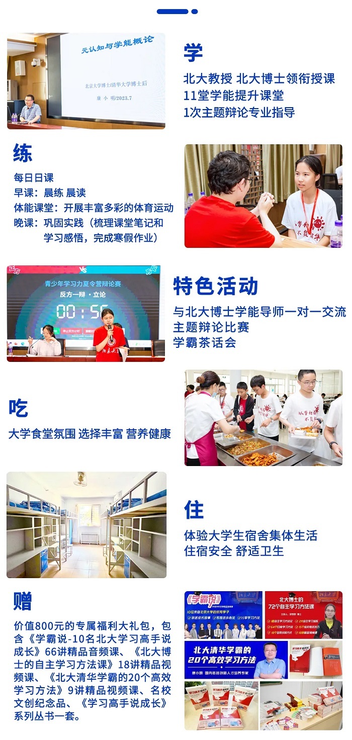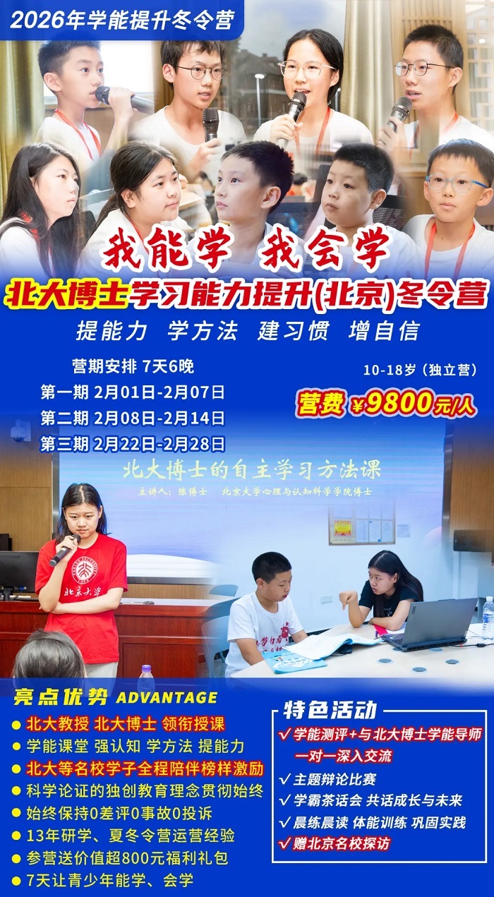 “我能学 我会学”北大博士学习能力提升(北京)冬令营是围绕学习力三要素(学习动力、学习毅力、学习能力)之一的学习能力,结合学习力夏冬令营北大学霸好方法研发团队在对上百名北大优秀学子深度访谈研究后提炼出的成为学习高手的三大秘籍,由北大教授、北大博士领衔授课,让青少年与优秀者同行,通过名师专家系统的学能课程、名校学霸系统的学习方法分享、主题辩论赛等科学有效的课程和体验互动式的教学方式,体验互动式的教学方式,全方位提升青少年的学习能力,包括元认知能力、专注力、记忆力、思维力、时间管理能力、自主学习能力……以及学习掌握清北优秀学子的高效学习方法,让青少年们学会学习、爱上学习,建立学习自信,点燃学习热情,开启坚定的学习之路,愿学、能学、会学,从而获得决胜未来的关键底层能力——学习力。
