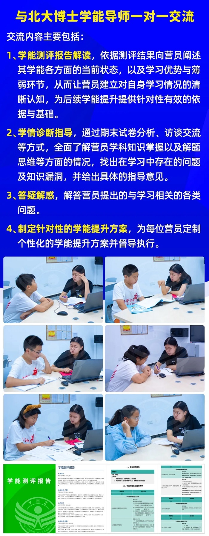 3、学霸同行 榜样激励 | 由北大学子领衔的高校优秀学子组成的辅导员团队24小时全程陪伴引导,与营员同学同玩同吃同住,并与北大博士学能导师进行一对一深入交流,浸润式互动教育,榜样的力量激励成长。
