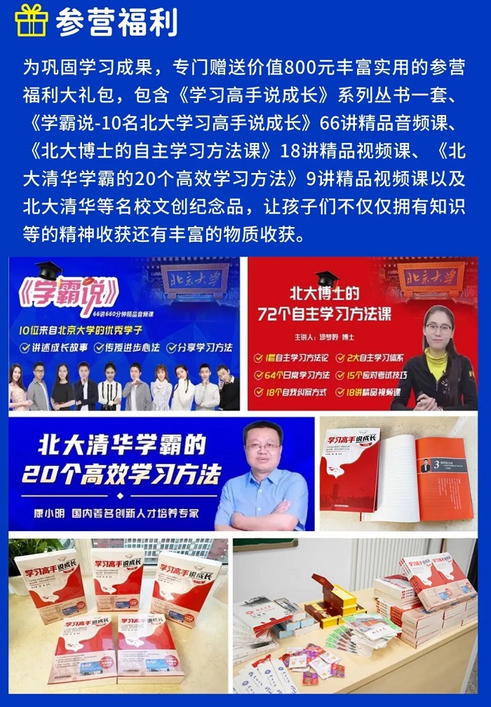 7、参营福利 物超所值 | 为巩固学习成果,专门赠送价值800元丰富实用的参营福利大礼包,包含价值168元的《学习高手说成长》系列丛书一套、价值299元的《学霸说-10名北大学习高手说成长》66讲精品音频课、价值299元的《北大博士的自主学习方法课》18讲精品视频课、价值199元的《北大清华学霸的20个高效学习方法》9讲精品视频课以及北大清华等名校文创纪念品,让孩子们不仅仅拥有知识等的精神收获还有丰富的物质收获,带着满满的收获,智创未来。