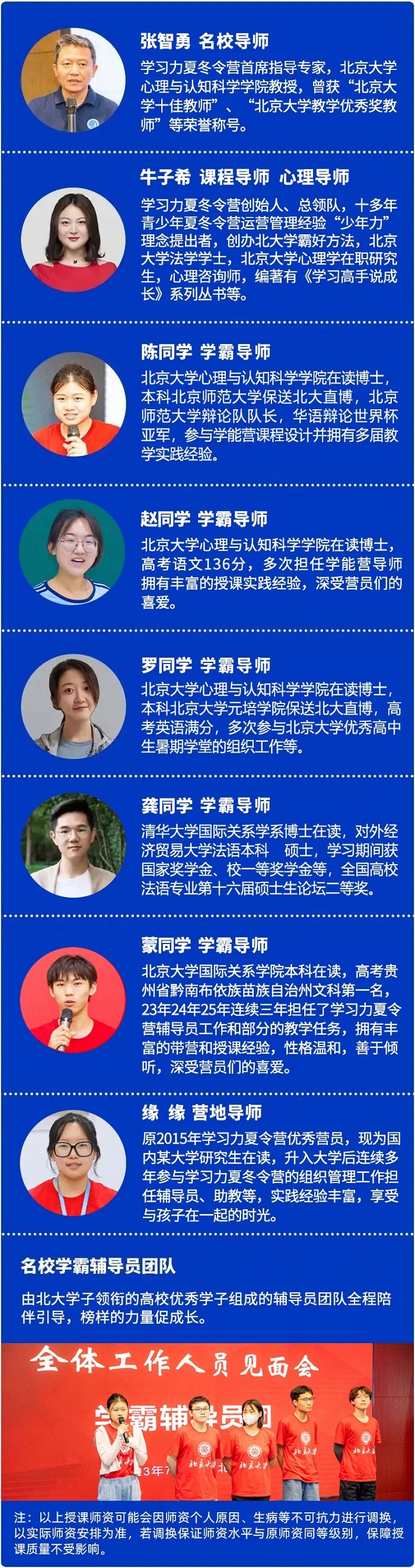 2、名校名师 权威保障 | 由北大等知名高校领衔的名校导师、学习力导师、心理导师、学霸导师、营地导师等组成的强大导师团队授课辅导,深度的互动交流,全方位的保障关注每一个营员的收获与成长。