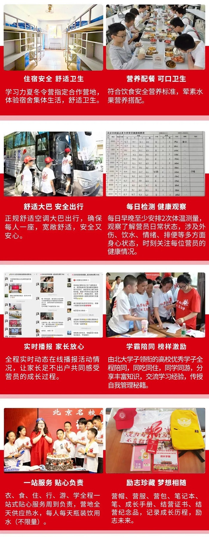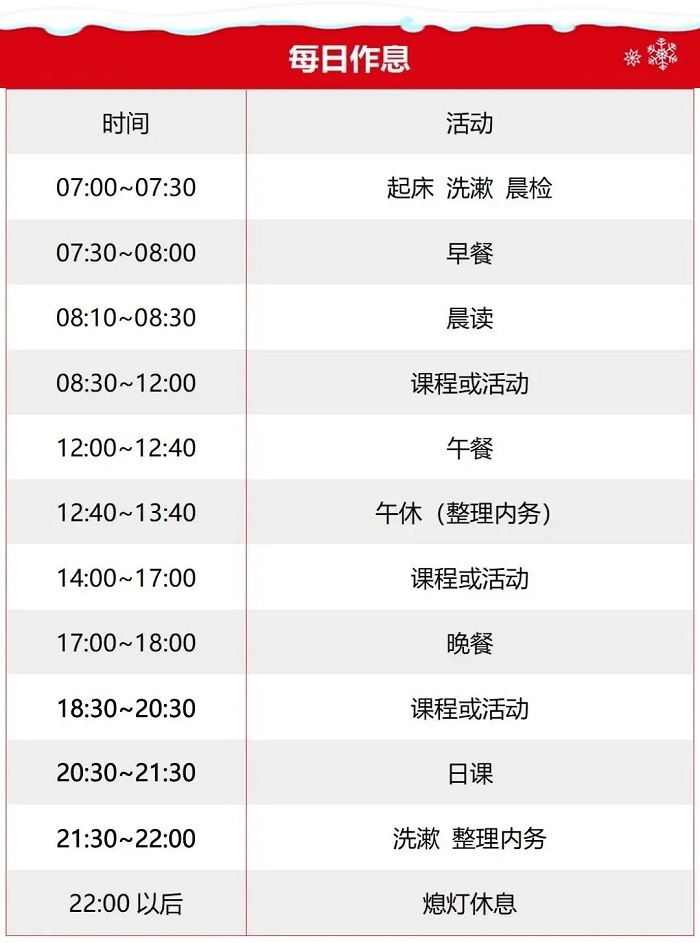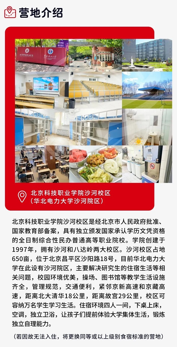 住宿标准:指定合作营地,封闭式管理,大学生宿舍4-6人/间,空调、卫浴。