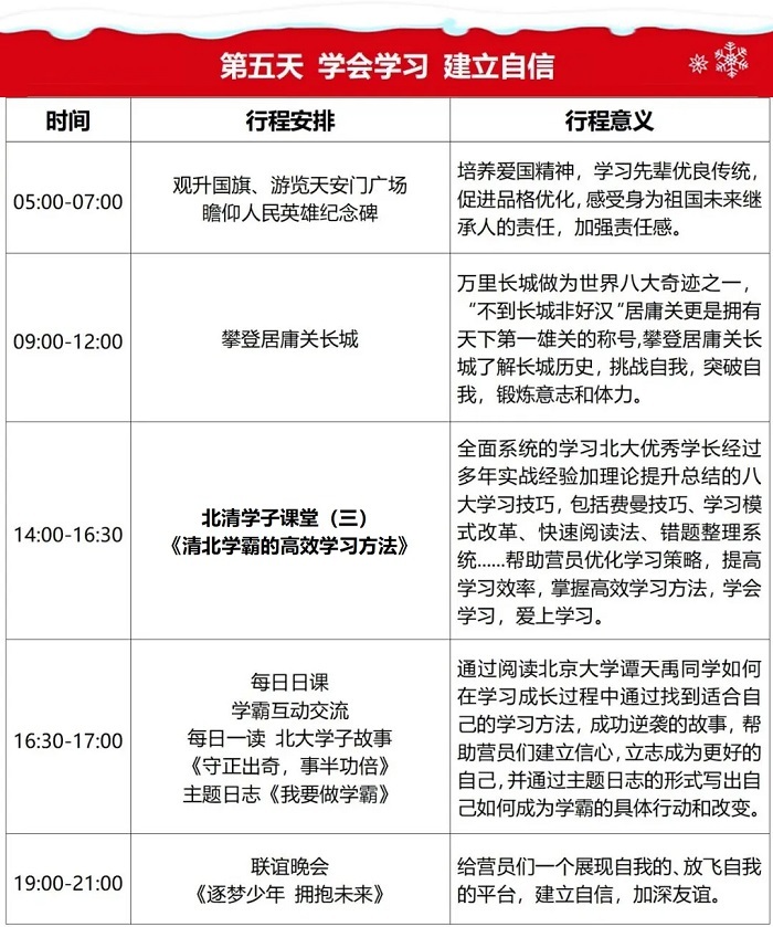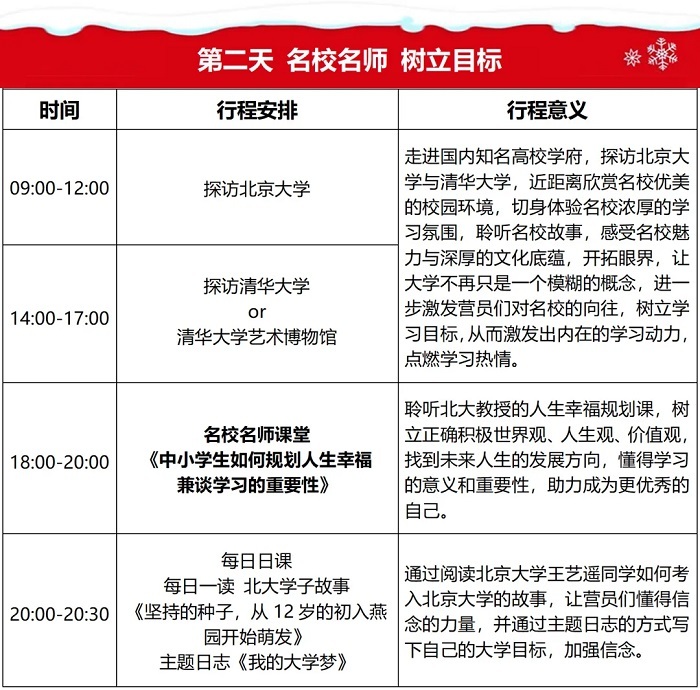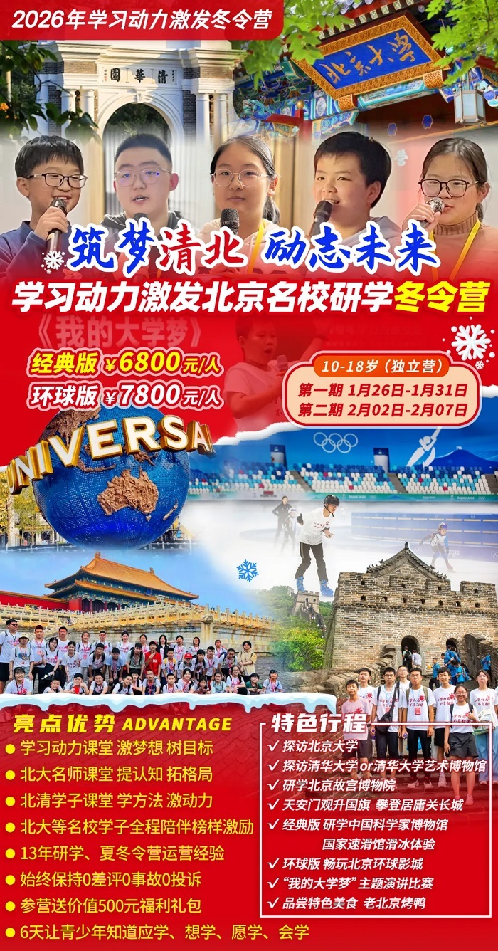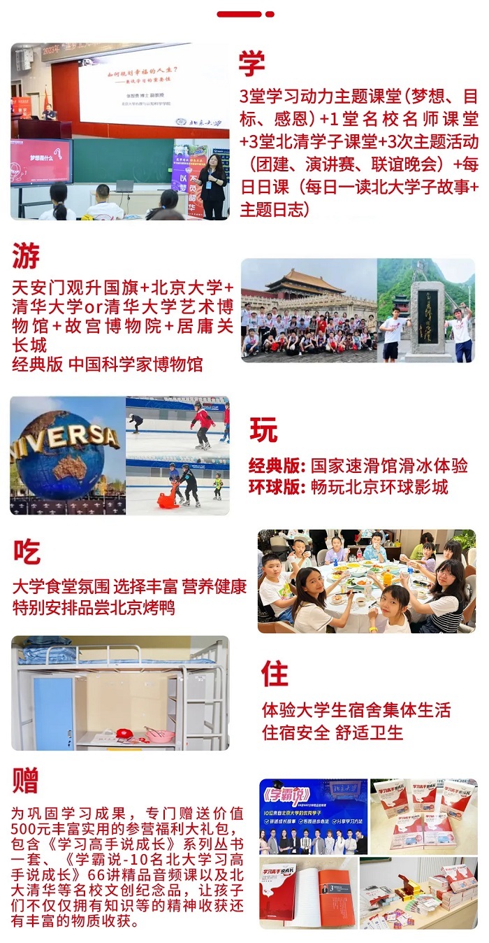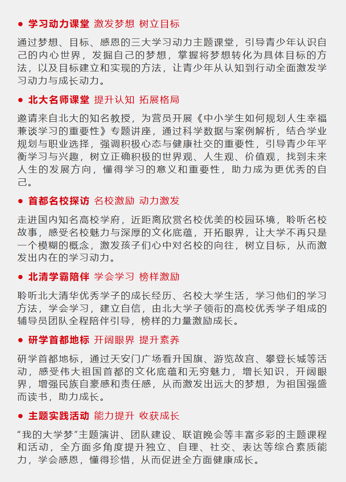 “筑梦清北 励志未来”学习动力激发北京名校研学营旨在通过梦想、目标等学习动力主题课堂,北大名师的幸福人生规划课,北大清华优秀学子的方法课,北大清华名校探访体验,北大等名校学子全程陪伴,“我的大学梦”主题演讲等围绕动力激发主题的全方面多角度沉浸式的系列课程和活动,帮助青少年开阔眼界、提升认知、激发梦想、树立目标、学会学习,建立自信,从而激发出青少年内在的学习动力和成长动力,让青少年们知道应学、想学、愿学、会学,助力他们可以自主的开创自己美好幸福的未来。