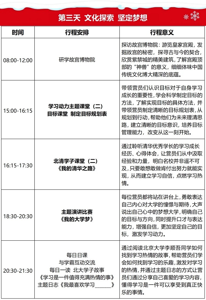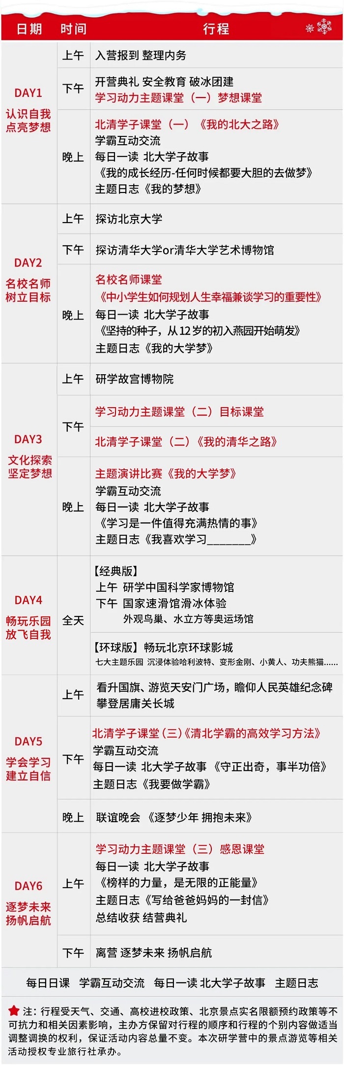 行程受天气、交通、高校进校政策、北京景点实名限额预约政策等不可抗力和相关因素影响,主办方有权对行程的顺序和行程的个别内容做适当调整调换,保证活动内容总量不变。