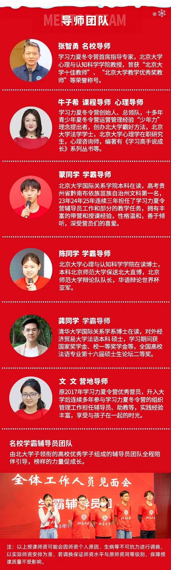 师资配比:不低于1:10,由北大优秀学子领衔的名校优秀学子辅导员团队;另每期配专业的营地导师、队医、教官安全员、外出导服人员、营地管理人员等。