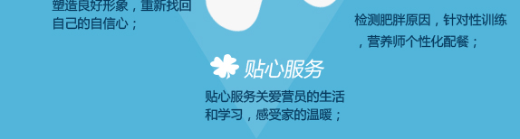 通过科学的锻炼、合理的饮食搭配,并辅助以治疗手段,争取让营员逐步养成良好的生活习惯,实现科学减肥。